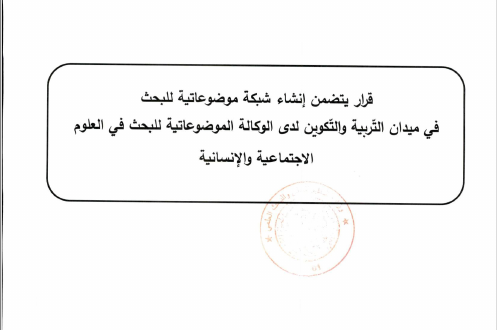 صدور القرار الوزاري حول إنشاء شبكة موضوعاتية للبحث في ميدان التربية والتكوين لدى الوكالة الموضوعاتية للبحث في العلوم اللاجتماعية والإنسانية.شبكة-موضوعاتية-للبحث-التربية-والتكوين-و.م.العلوم-الاجتماعية